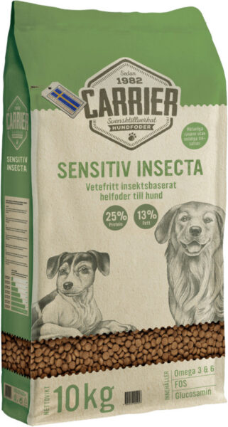 CARRIER SENSITIV INSECTA är sammansatt av högkvalitativa råvaror som ger fodret en mycket hög smältbarhet och täcker din hunds dagliga näringsbehov. Innehåller fettsyrorna Omega 3 (EPA/ DHA) och Omega 6.