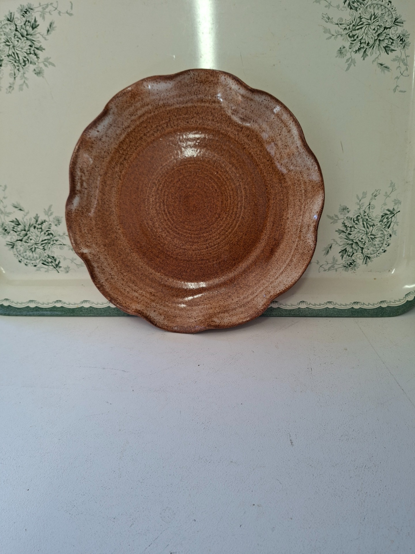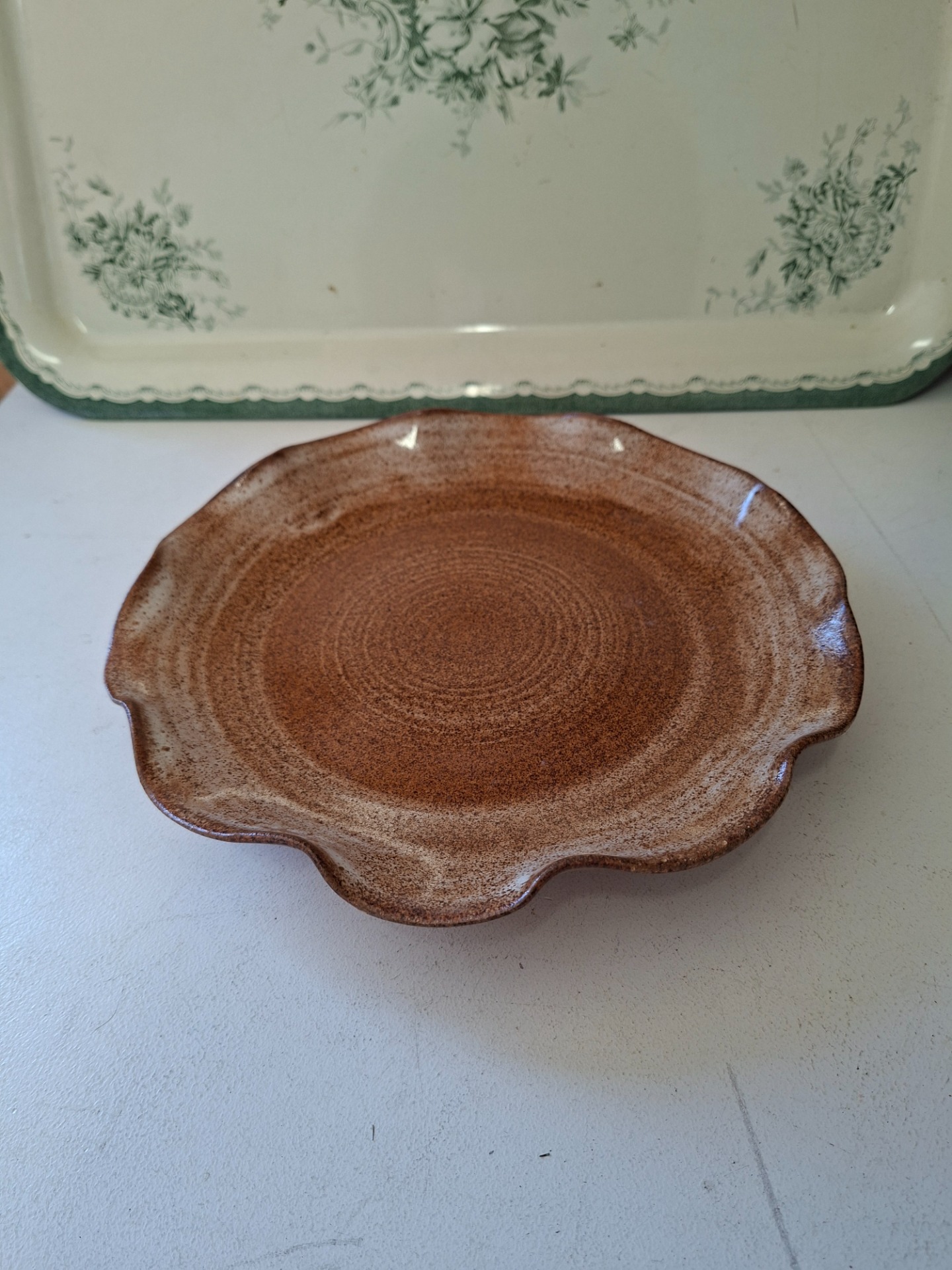 Handtillverkat brunt fat/tallrik med dekorativa, vågiga kanter för servering, ljusbricka eller utsmyckning av hemmet.