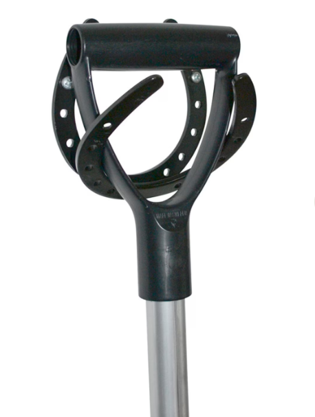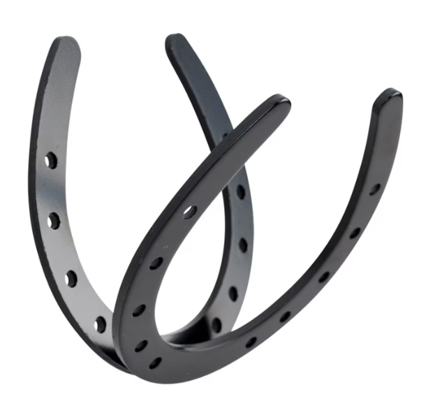 Kraftig hängare/krok för greparna i stallet i form av svartlackerade hästskor.