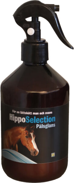 HippoSelection Pälsglans ger en långvarig glans. Pälsglansen är damm, smuts och vattenavvisande och fläckar av gödsel och urin går enkelt att borsta bort. HippoSelection Pälsglans kladdar inte. Svans och man blir lättskötta och därmed kan knutor undvikas. Ger även en vattenavvisande och högglansig yta. Ingen karenstid. Säljs i flaskor om 500 ml, spraypump ingår.