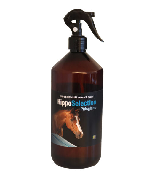 HippoSelection Pälsglans ger en långvarig glans. Pälsglansen är damm, smuts och vattenavvisande och fläckar av gödsel och urin går enkelt att borsta bort. HippoSelection Pälsglans kladdar inte. Svans och man blir lättskötta och därmed kan knutor undvikas. Ger även en vattenavvisande och högglansig yta. Ingen karenstid. Säljs i flaskor om 500 ml & 1 liter, spraypump ingår.