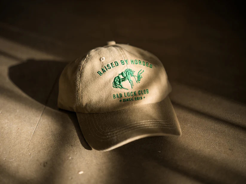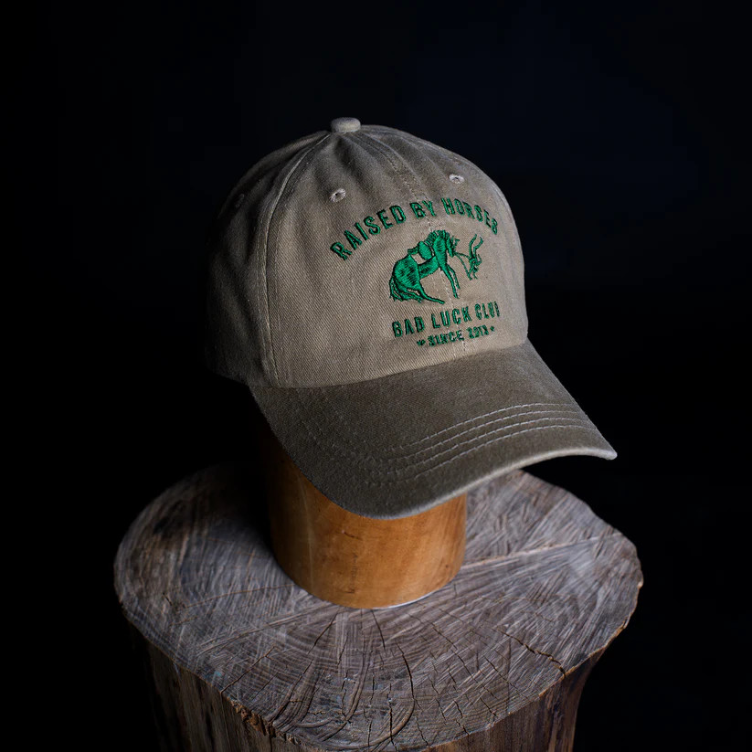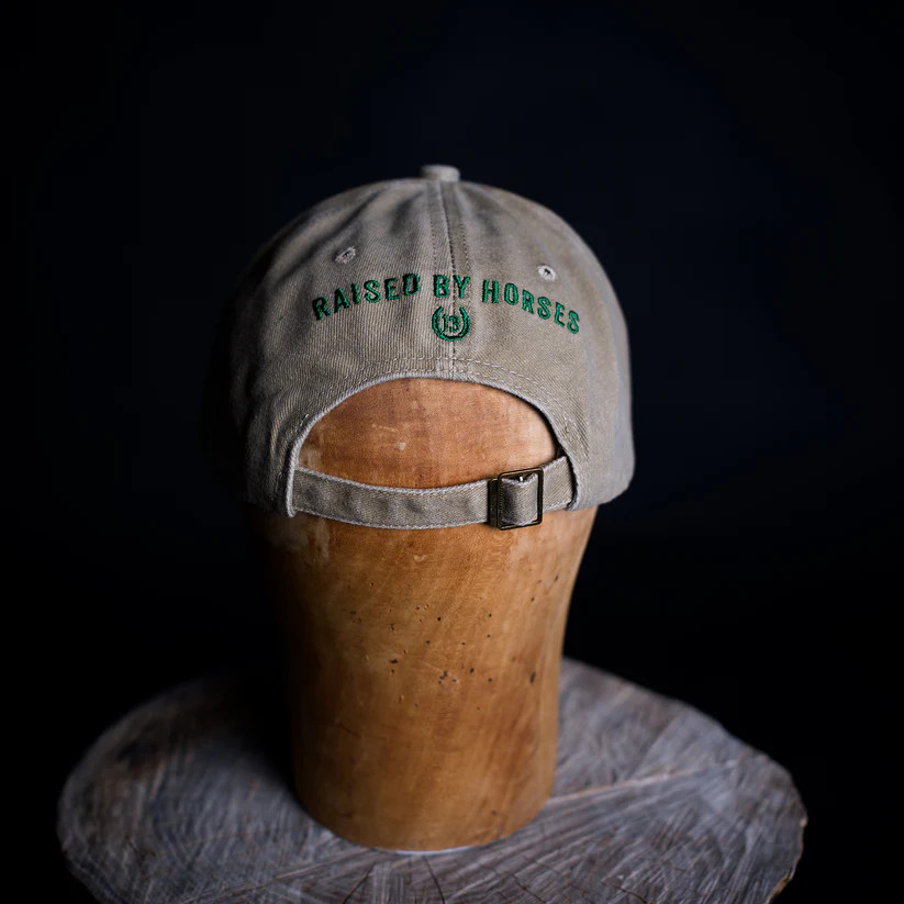 Supersnygg beige keps i tvättad bomull med grönt hästmotiv. Passar lika bra i stallet som till vardags.