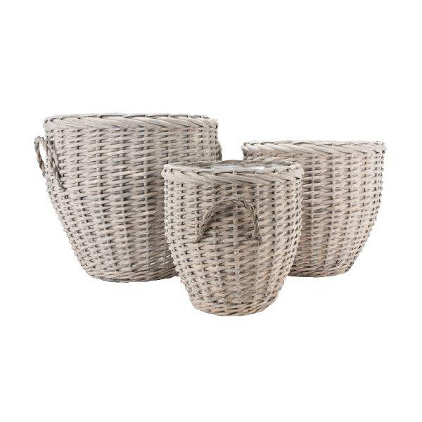 Äggformade, flätade korgar med dekorativa handtag. Passar utmärkt för trädgården och altanen. Kan köpas var för sig eller som hel grupp.