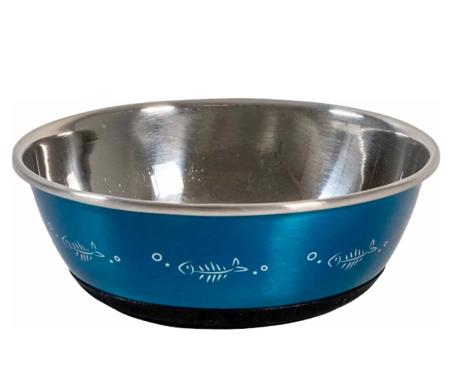 Rostfri skål till katt för vatten och foder med antislip-botten. Rosa med fiskmönster. Storlek 12,5 cm, rymmer 350 ml. Finns i färgerna rosa eller blå.