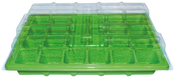 Minidrivhus med såbricka och lock för förodling av frön och sticklingar. Lämpar sig för odling av små plantor. 38x25x15 cm, 24 fack.