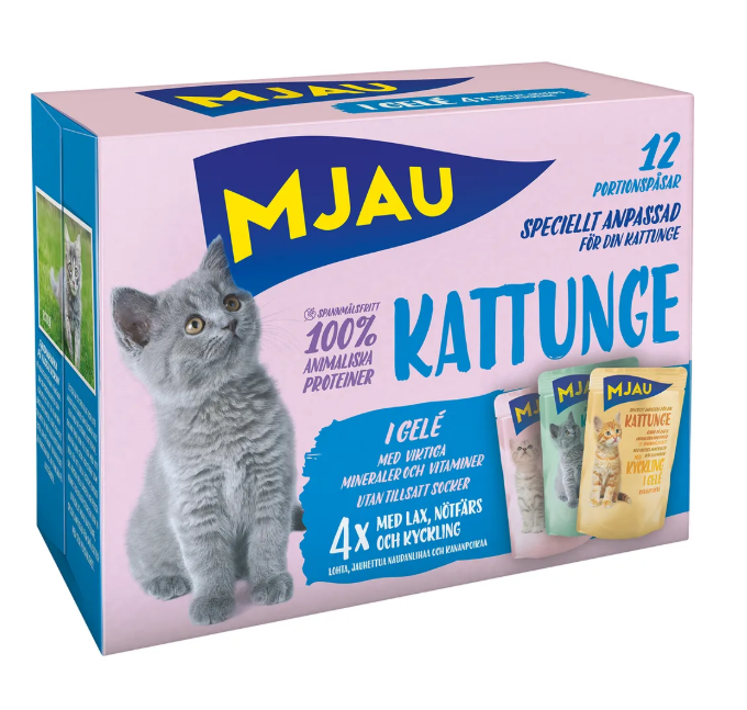 Mjau multibox kattunge innehåller 12 stycken portionspåsar (à 85 gram) bitar i gelé med smakerna lax, nötfärs och kyckling. De små, smakrika bitarna passar perfekt för den lilla kattungen. Samtliga smaker innehåller alla viktiga mineraler och vitaminer som en kattunge behöver. Dessutom är våtfodret helt spannmålsfritt och innehåller inget tillsatt socker.
