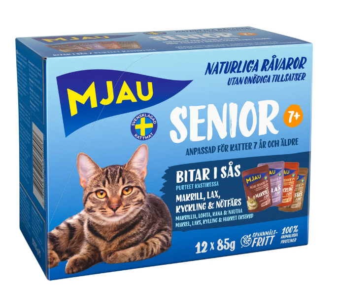 Mjau multibox Senior bitar i sås med fisk- och köttsmak innehåller smakerna makrill (3 st.), lax (3 st.), kyckling (3 st.) och nötfärs (3 st.). Varje 85-grams måltid är kärleksfullt tillagad med naturliga råvaror. Fodret innehåller 100% animaliska proteiner, utan varken tillsatt socker eller spannmål, samt är anpassat för äldre katter med tillsatt biotin, FOS och extra taurin. Varje rätt blir en precis lagom stor måltid för din katt. Färdig att servera!