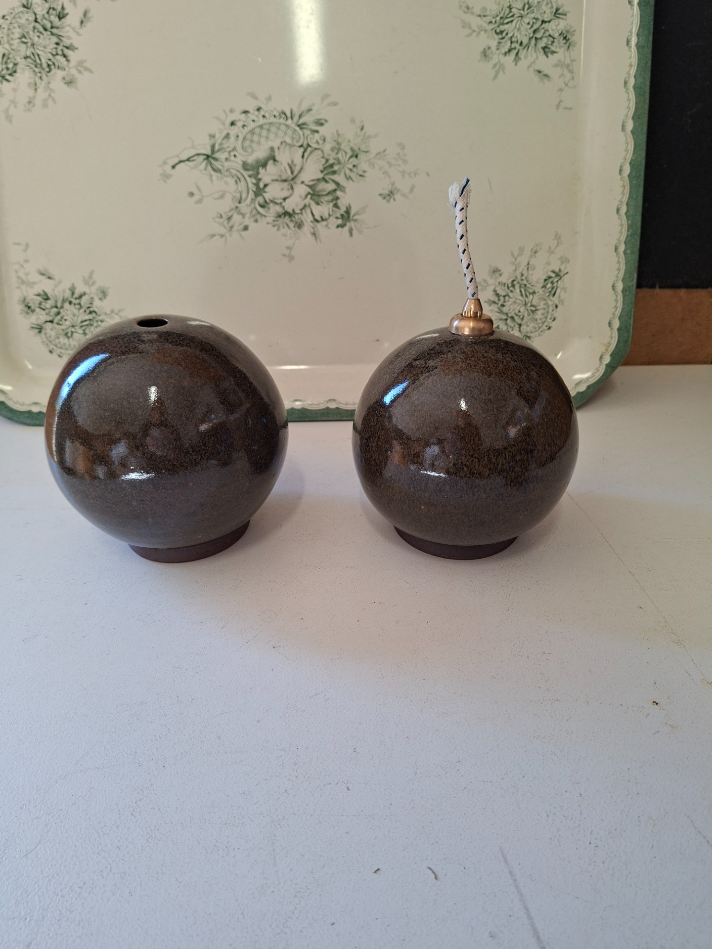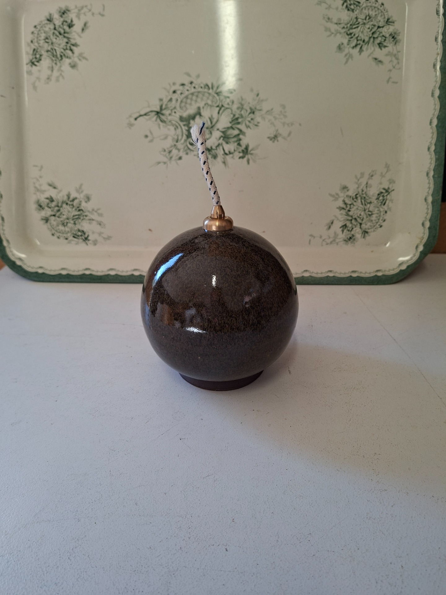 Oljelampa i stengods med en djup skogsgrön färg och vekhållare i mässing.