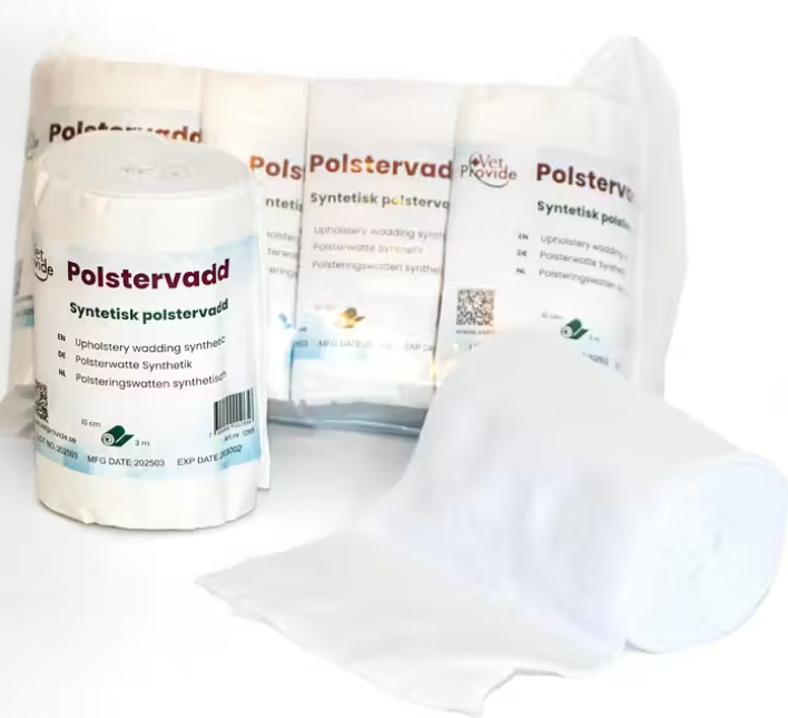 VetProvide Polstervadd är tillverkad av 100% polyester och behåller sin mjukhet och elasticitet även vid långtidsbehandling. Den är luftgenomsläpplig, absorberar inte fukt och är enkel att riva i rätt längd. Perfekt för sårbehandling, kompressionsbandage och som polstring där extra komfort och stabilitet behövs.