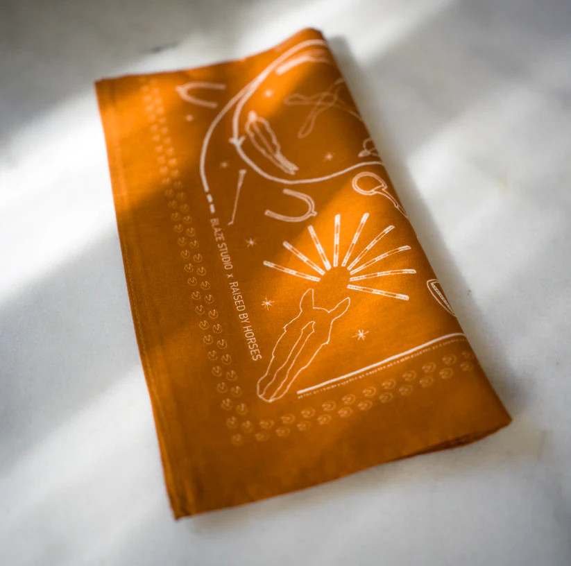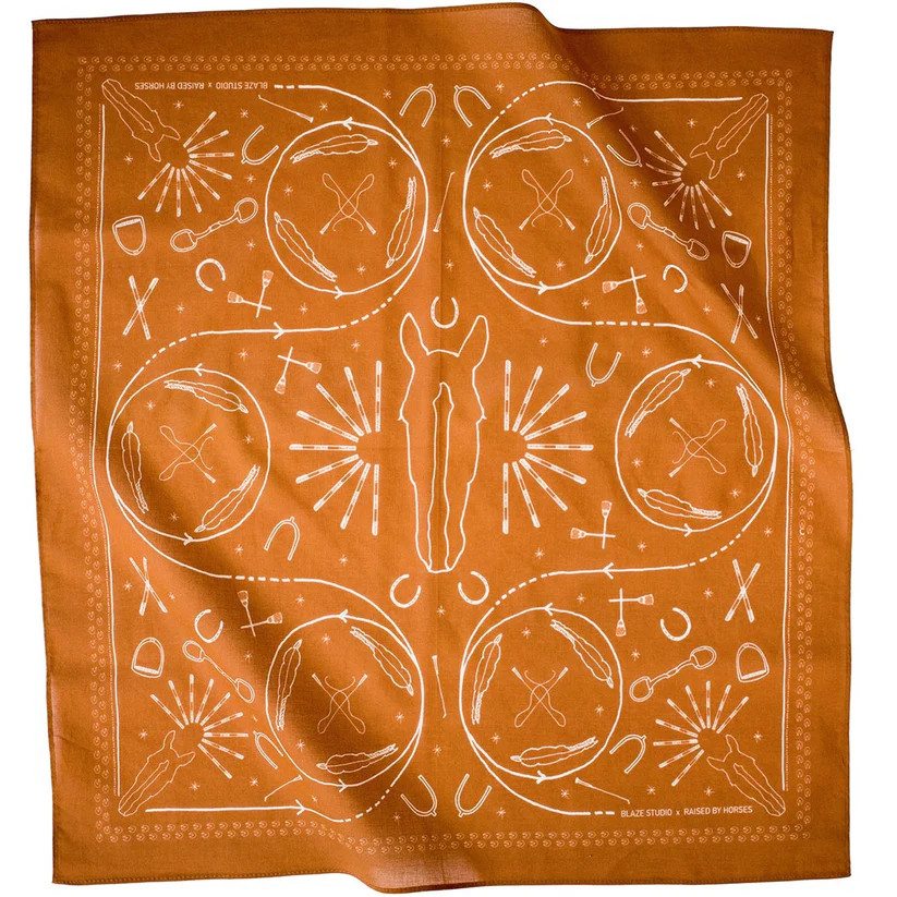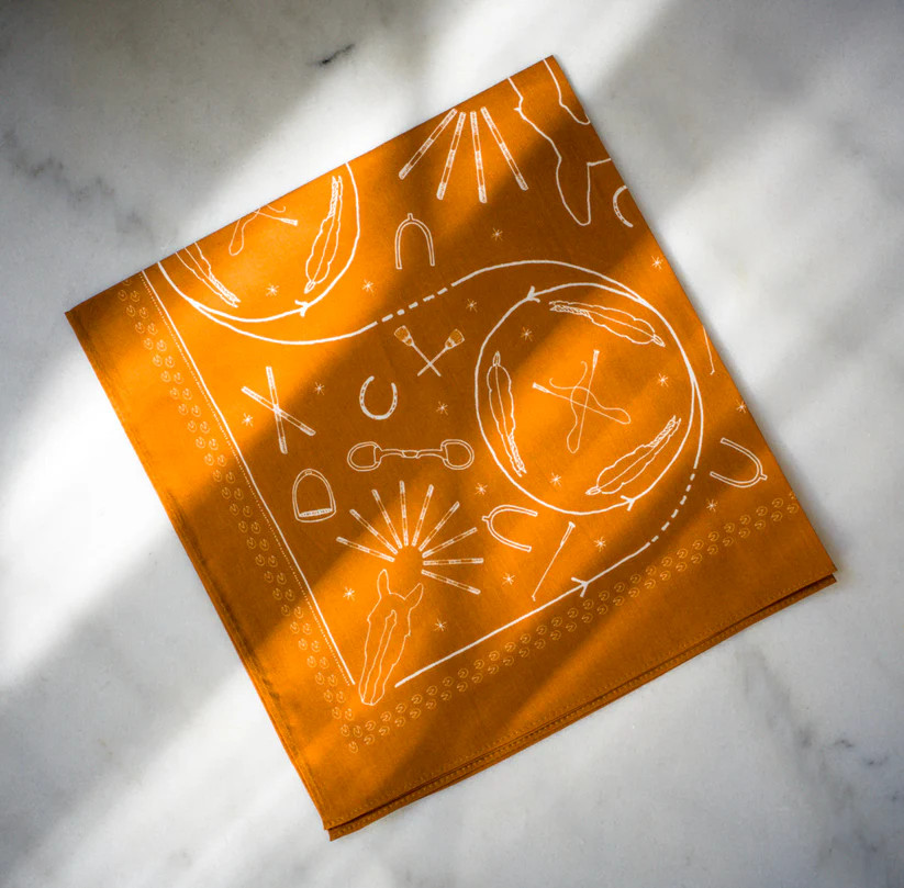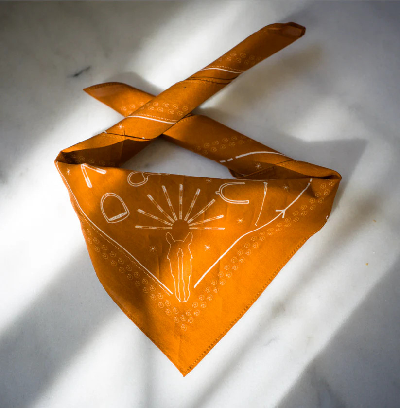 Saddlery Scarf är ritad för hand och tryckt på ett mjukt bomullstyg. Färgen är en varm terracotta inspirerad av stallets tegelväggar och ridhusets underlag.